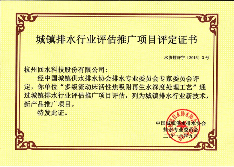 公司“多级流动床活性焦吸附再生水深度处理工艺”通过专家评审,被列为国家城镇排水行业新技术、新产品;