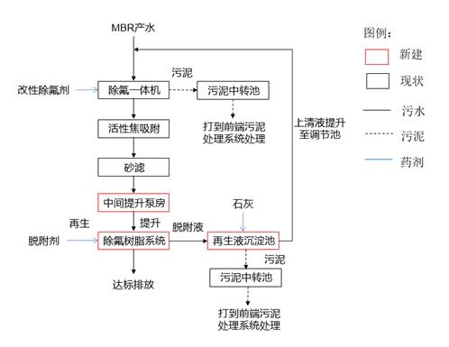 1、流程说明:MBR出水自流进入除氟一体机,在除氟一体机内投加除氟剂和PAM,混凝反应形成絮体,并在池内完成泥水分离,经过现状除氟一体机的处理后清液自流进入活性焦吸附塔,浮渣进入污泥中转池,经过现状活性焦和砂滤的处理后出水自流进入除氟原水池,通过提升泵提升进入除氟树脂系统,树脂吸附后出水达标排放,除氟树脂系统吸附饱和后进行脱附,脱附液另设装置进行处理。