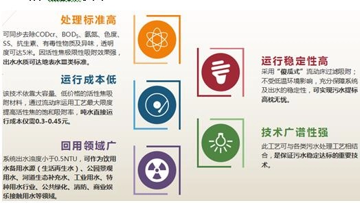 利用活性焦材料物理吸附及过滤功能,可同步吸附污水中的CODcr、BOD5、LAS、石油类、余氯、臭味、色度、有毒性物质,以及少量的有机磷和有机氮;借助流动床的深床滤层可截留SS、胶体物及少量磷酸盐絮体。适合做为市政污水、工业污水深度处理。活性焦技术工艺用于深度处理出水主要指标可达到地表水准Ⅲ类水质,且水质感观清澈透亮,可做为再生水资源循环利用,缓解许多缺水城市的用水问题。