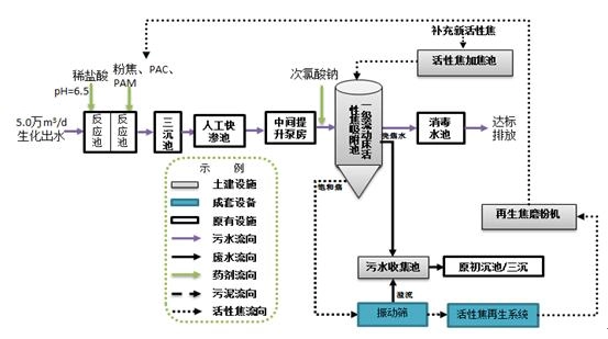 生化二沉池出水,先加稀盐酸调节pH=6.5左右,投加粉末活性焦反应吸附20-30min,再投加PAC、PAM絮凝反应后进入三沉池进行沉淀分离,出水自流入人工快渗池,人工快渗池出水自流入到中间提升泵房,由提升泵将废水送入一级流动床活性焦吸附池,并在进水中投加次氯酸钠防止生物菌在活性焦吸附塔中挂膜,影响活性焦吸附功能。流动床活性焦吸附塔对CODcr、色度、臭味等污染物进行有效的吸附去除后,出水再自流入接触消毒池达标排放。
