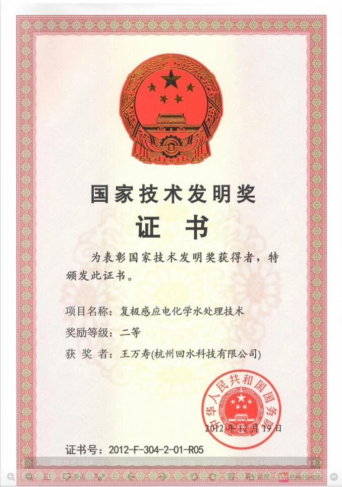 公司与中国科学院生态环境研究中心共同研发的“复极感应电化学水处理技术”获得国家技术发明二等奖