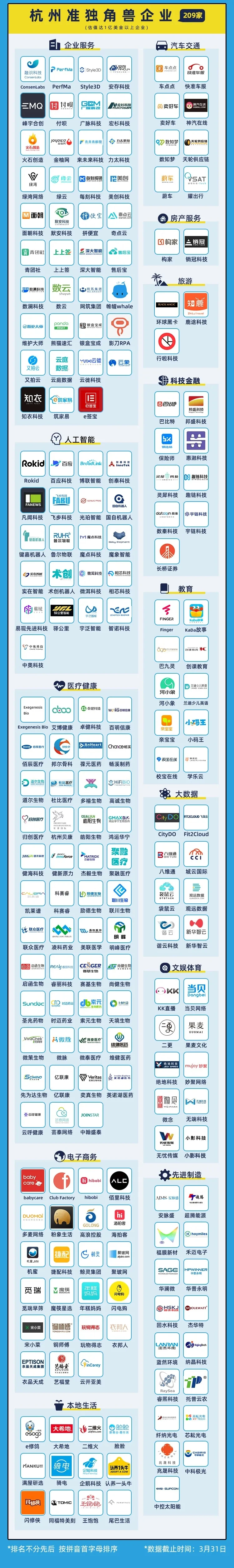 2021年4月28日,杭州市人民政府、民建浙江省委、中国投资发展促进会共同主办的第五届万物生长大会在杭州国际博览中心隆重开幕,会上,杭州市创业投资协会联合一站式创业服务平台「微链」共同发布《2021杭州独角兽&准独角兽企业榜单》。截至2021年3月31日,杭州共有独角兽企业(估值不少于10亿美元)37家,准独角兽企业(估值不少于1亿美元)209家。