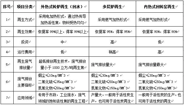 活性炭的再生方法有很多种,例如:加热再生法、生物再生法、湿式氧化法、溶剂再生法、电化学再生法、催化湿式氧化法等。从性能恢复率、损失率、运行成本综合比较来说,产业化应用最广泛、最合适的是加热再生法,下表是常见的三种加热再生法: